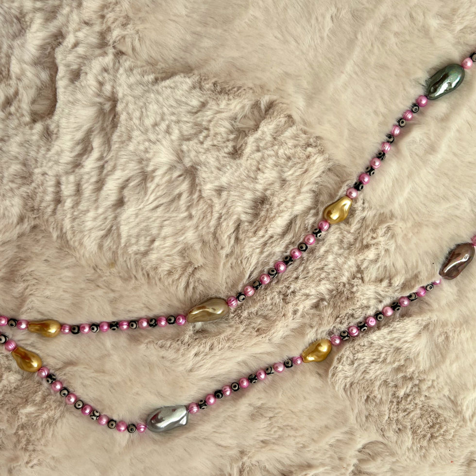 Feita com: pérolas de água doce e contas Dzi tibetanas. Metais em níquel.