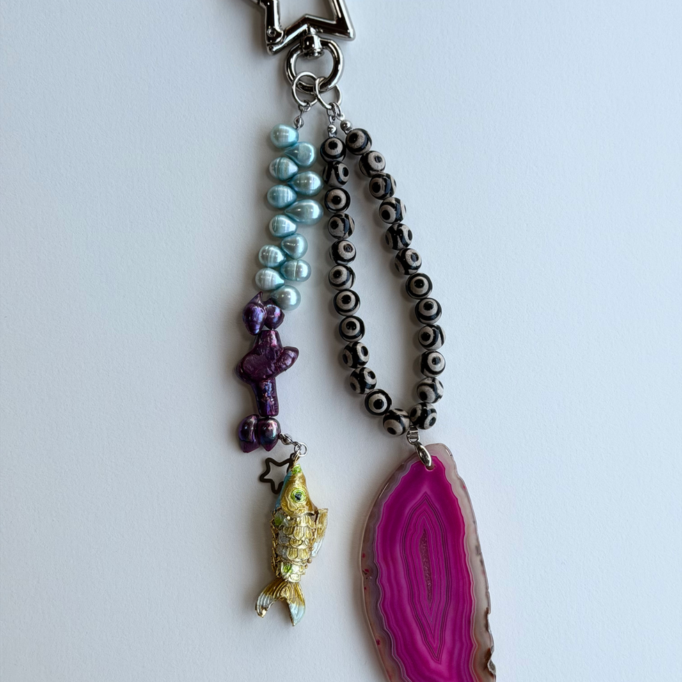 Feito com: contas Dzi tibetanas de ágata, pérolas de água doce, pingente peixe "Lucky Koi" chinês articulado e chapa de ágata pink. Metais em níquel. Devido ao uso de pérolas de água doce, é possível observar variações de tonalidade e forma ao fazer seus pedidos.
